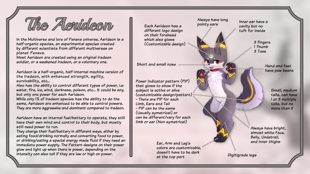 Born from experimentations on Iradeons, Aerideons are a half-organic, half-internal machine species, that possess enhanced strengh, agility, survivability. Even being able to control elemental powers like water, fire or ice! (More species info in cover pictures)
