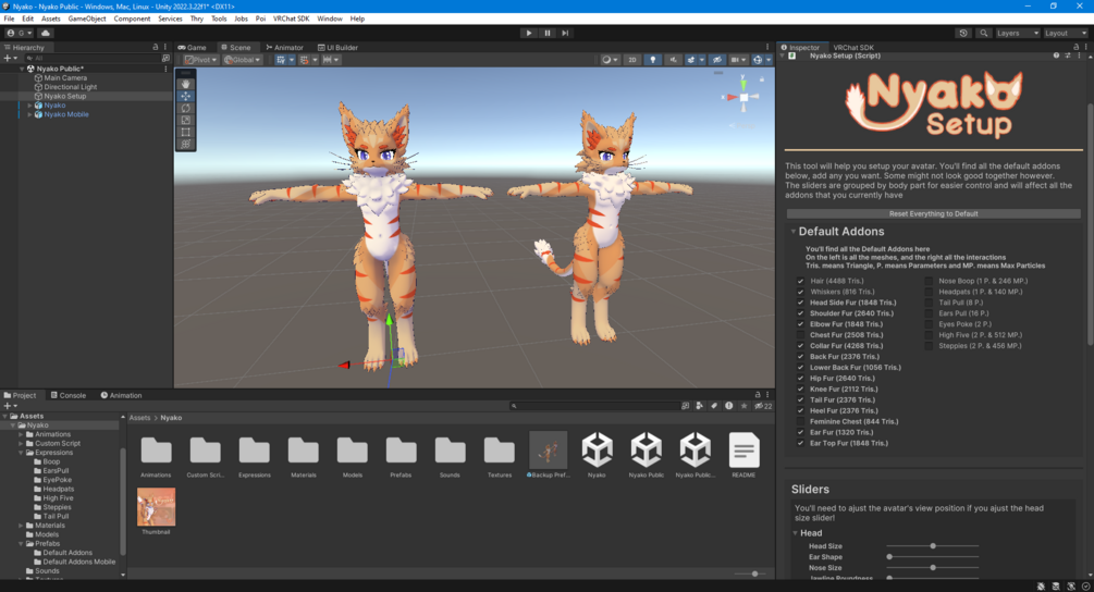 5. Click on the "Nyako Setup" object in the hierarchy to open to customisation panel, and customise your avi how you want